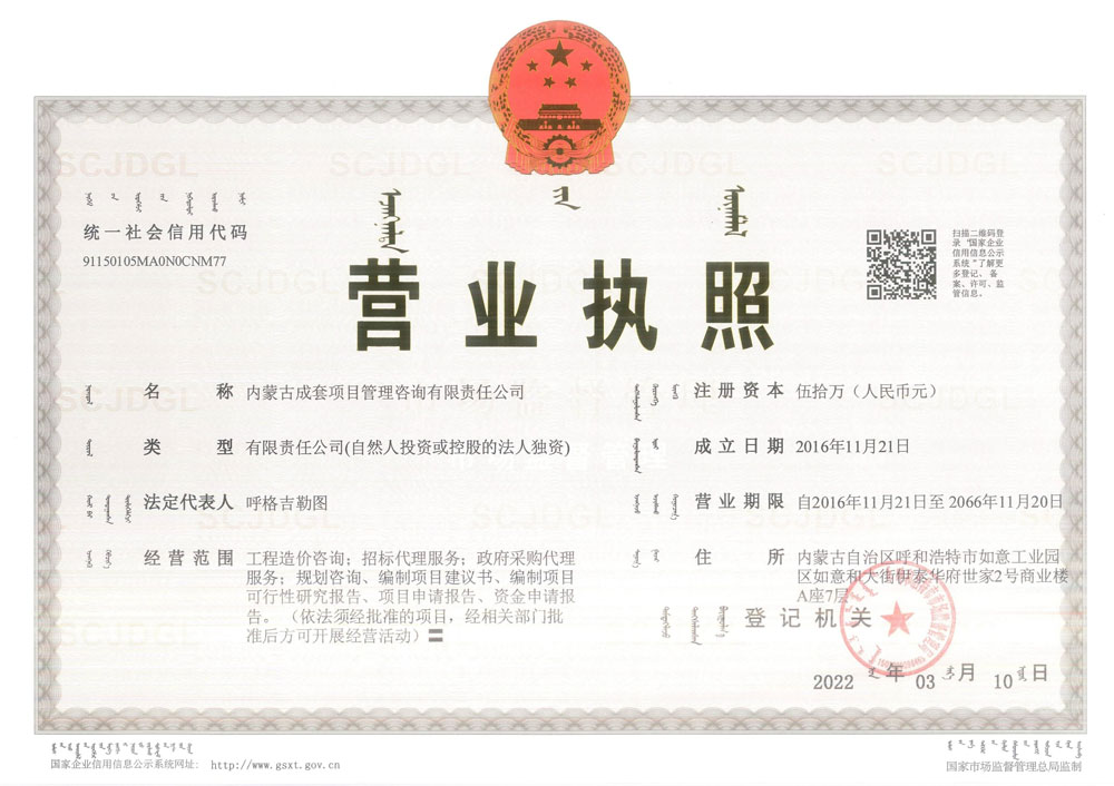 內蒙古成套項目管理咨詢有限責任公司營業執照